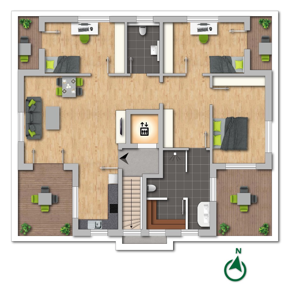 - Bäder mit hochwertiger Keramik sowie Echtglas-Duschabtrennungen