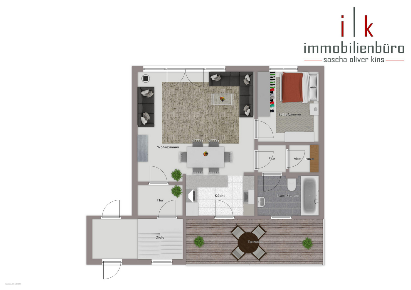 Der Schlafbereich bietet genügend Platz für ein Doppelbett und zusätzliche Möbel. Ein angrenzender Abstellraum schafft zusätzlichen Stauraum. Der Flur bietet zudem Platz für eine Garderobe und verbindet die Bereiche der Wohnung auf kurze und übersichtliche Wege.